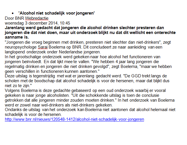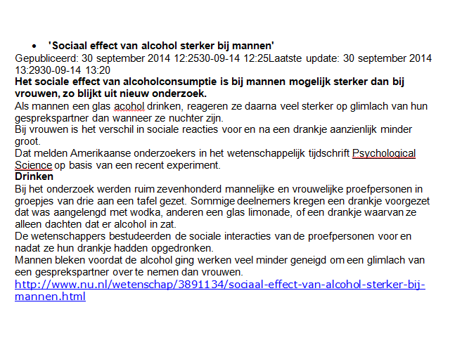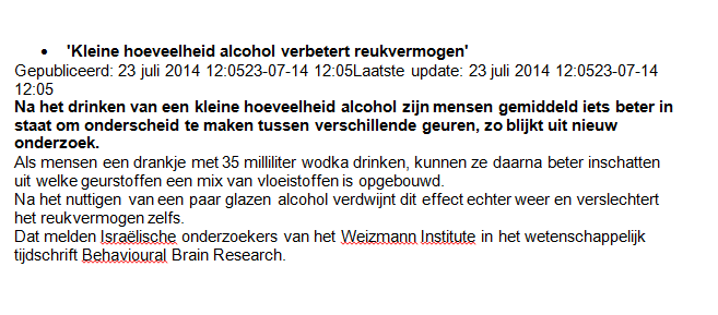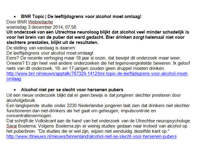 Hier staan 5 krantenartikelen die over het laatste nieuws van alcoholgebruik gaan.